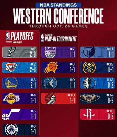 ปัจจุบัน หลังจากสองเกมแรกของฤดูกาลใหม่ ร็อคเก็ตส์, แมฟเวอริกส์ และเพลิแกนส์ต่างก็ยากที่จะคว้าชัยและเสมอกันเป็นอันดับสุดท้ายในการประชุมสายตะวันตก ขณะที่สเปอร์สและธันเดอร์ผู้ป้องกันแชมป์เป็นผู้นำการประชุมสายตะวันตกด้วยสถิติชนะ 2 แพ้ 0