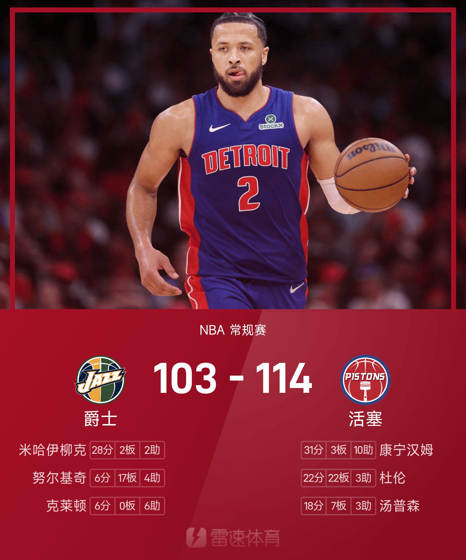 คันนิงแฮมมี 31 แต้ม 10 แอสซิสต์ ดูเรนมี 22 แต้ม 22 รีบาวน์ และพิสตันส์เอาชนะแจ๊ส