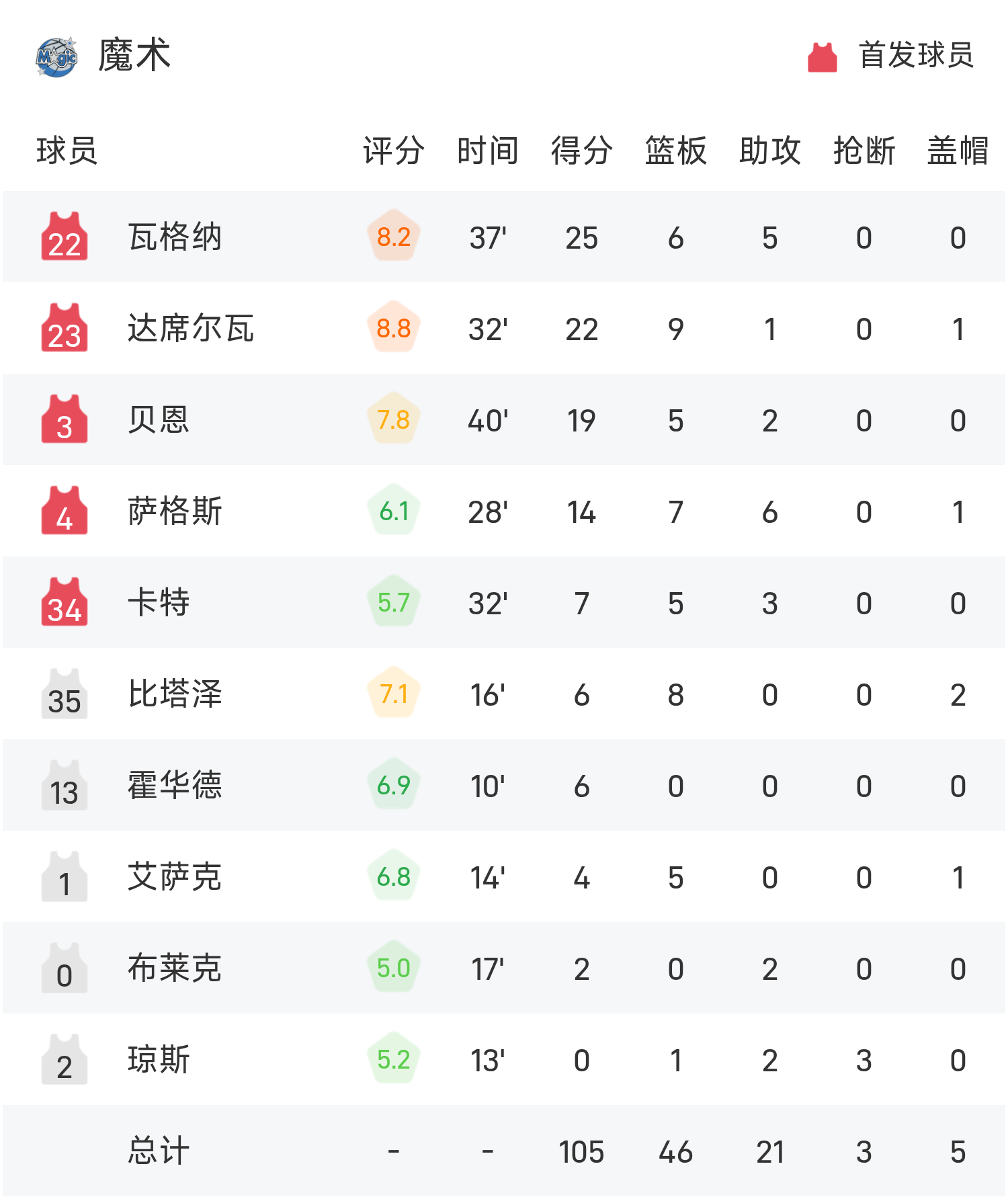 วากเนอร์ทำคะแนนสูงสุดในเกม 25 แต้ม 6 รีบาวด์ และ 5 แอสซิสต์ นำทีมเมจิกคว้าชัยชนะ