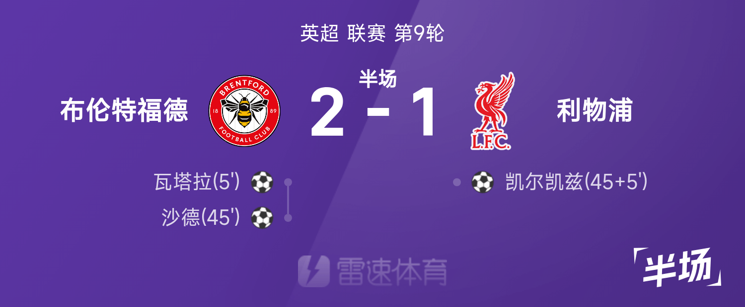 พักครึ่งพรีเมียร์ลีก: วอตทาราทำประตูจากฮุกข้าง, เบรนท์ฟอร์ด ชนะลิเวอร์พูล 2-1 ชั่วคราว