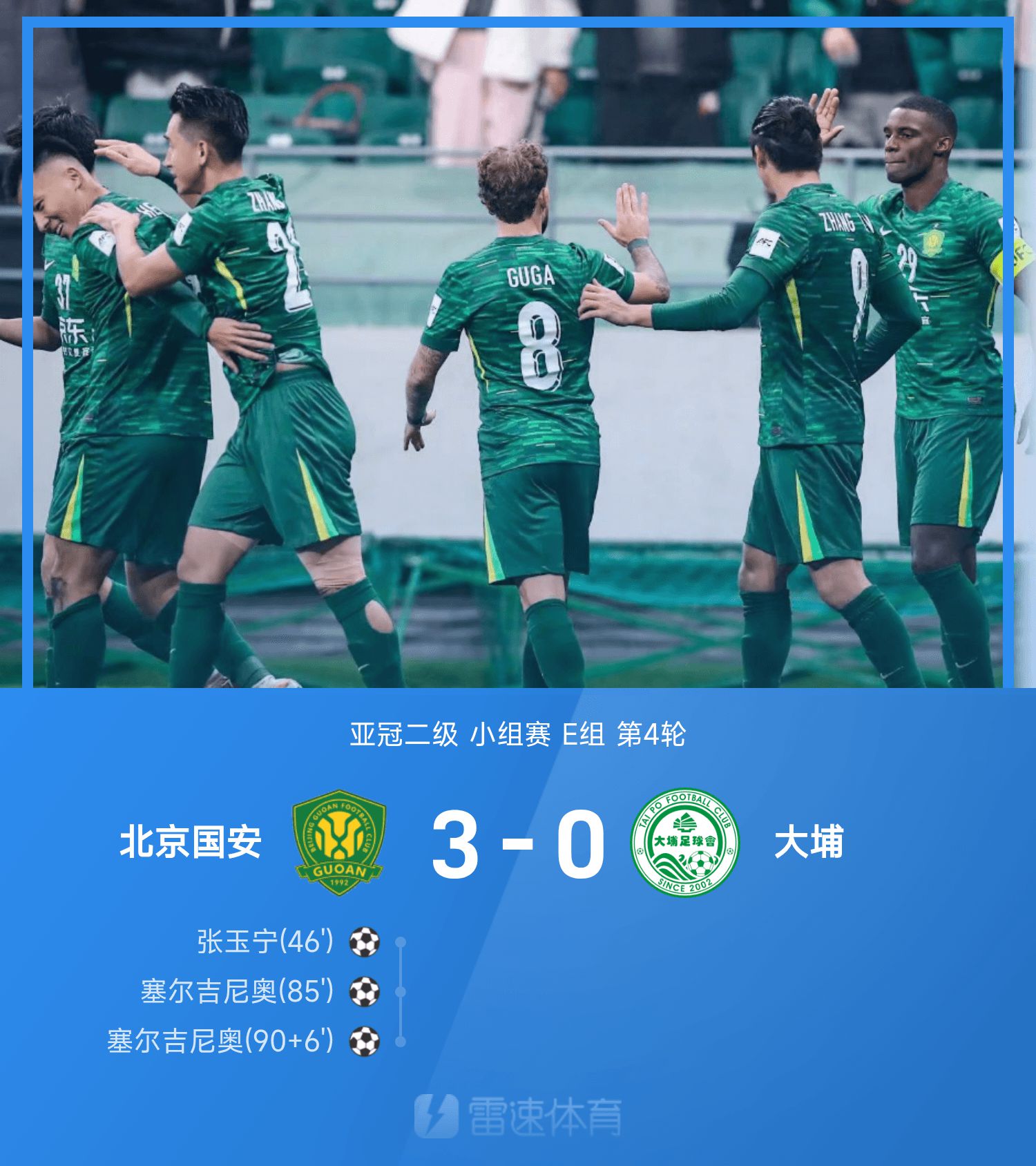 6686 Sports รายงานเมื่อวันที่ 6 พฤศจิกายนว่าในรอบที่ 4 ของกลุ่ม E ของการแข่งขันรอบสองกลุ่ม AFC Champions League 25/26 ปักกิ่ง กั๋วอันเอาชนะ Dabu 3-0 ในครึ่งแรก ทั้งสองทีมไม่ประสบความสำเร็จใดๆ และผู้รักษาประตู Guoan Zhang Jianzhi เกือบจะให้ของขวัญ เพียงหนึ่งนาทีในครึ่งหลัง Zhang Yuning ทำลายการหยุดชะงักของ Guoan จากนั้น Serginho ซึ่งเข้ามาในฐานะผู้เล่นสำรองก็ทำประตูได้สองครั้งรวมถึงประตูที่ตีกริ่งด้วย สุดท้ายปักกิ่ง กั๋วอันเอาชนะต้าบู่ 3-0 คว้าแชมป์เอเอฟซีแชมเปียนส์ลีกได้เป็นครั้งแรกในฤดูกาลนี้ และตกรอบท้ายสุดย้ายไปอยู่อันดับที่ 3