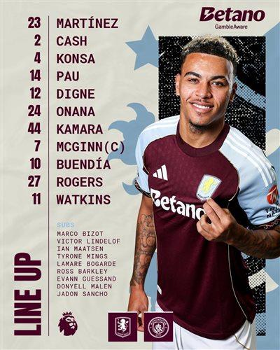 แอสตัน วิลล่า รายชื่อตัวจริง: 23-Martinez, 12-Digne, 4-Konsa, 2-Kash, 14-Torres, 7-McGin, 10-Buendia, 44-Kamara, 24-โอนาน่า, 27-โรเจอร์ส, 11-วัตกินส์