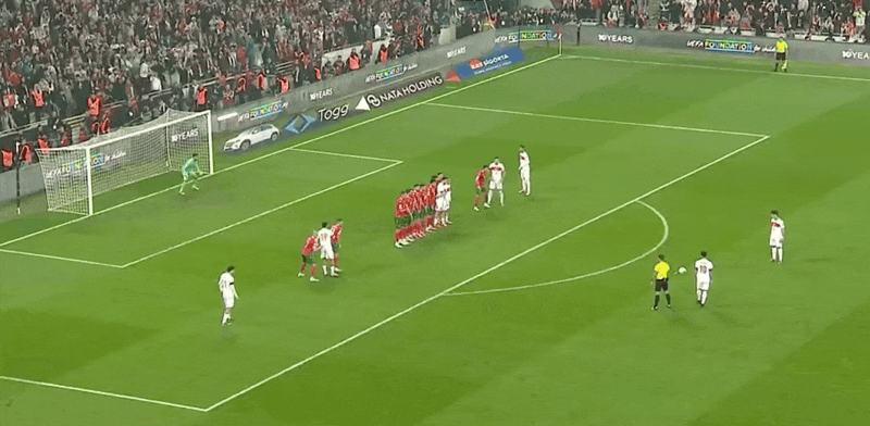 47' อัคตูโคกลูกระโดดสูงในโซนสามวินาทีแล้วโหม่งบอลเข้าหาประตู แต่โดนป้ายโฆษณา